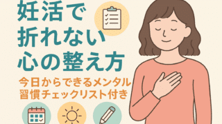 不妊症 妊活で折れない心の整え方|今日からできるメンタル習慣チェックリスト なぜ「心の持ち方」が妊活に大切なの?妊活は結果がすぐに見えにくく、月単位で気持ちが揺れやすい取り組みです。「頑張る=根性論」ではなく、再現性のある行動習慣に落とし込むことで、不安や焦りをやわらげ、日々の選択を整えやすくなります。コントロール... 2025.08.13 不妊症