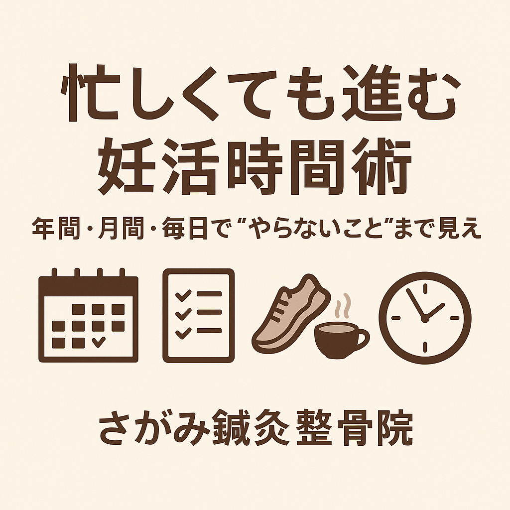 妊活は「時間×質」の勝負。ところが、忙しさと休日のダラダラが続くと、最も効果の出る行動(睡眠・食・運動・ケア)が後回しに。
