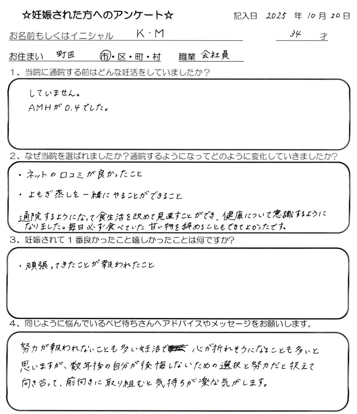 努力が報われないことも多い妊活で心が折れそうになることも多いと 思いますが、数年後の自分が後悔しないための選択と努力だと捉えて 向き合って、前向きに取り組むと気持ちが楽な気がします。