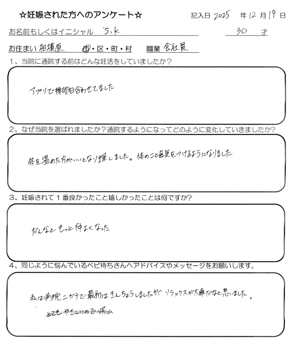 妊活のご感想(S・Kさん/相模原市/30歳/会社員)