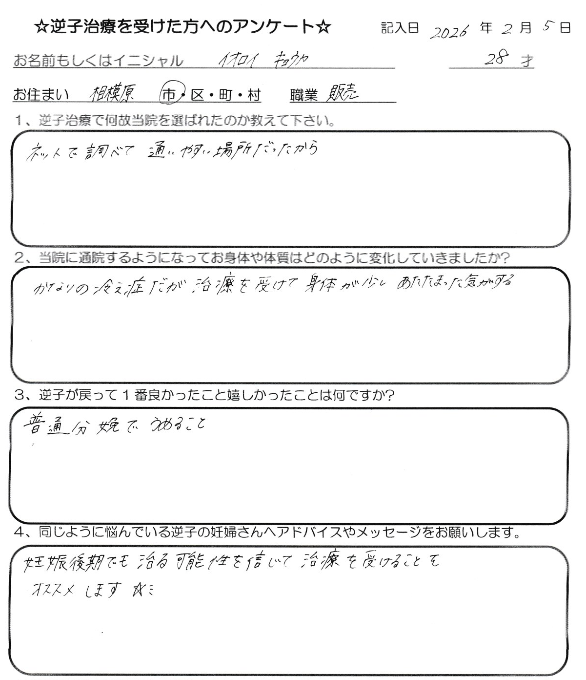 当院で逆子(骨盤位)ケアを受けられた方の体験談をご紹介します。妊娠週数が進んで不安が高まる時期でも、からだを整えることで前向きな変化が起きるケースがあります。