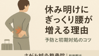 腰痛 連休明けの腰痛対策は町田の鍼灸整体へ|予防と対処 お盆・年末年始・ゴールデンウィークなどの休み明けは「ぎっくり腰」で来院される方がぐっと増えます。なぜ休み明けに集中するのか――理由と今すぐできる対策を、鍼灸整体の視点でわかりやすく解説します。休み明けにぎっくり腰が増える4つの理由1.生活リ... 2025.08.18 腰痛