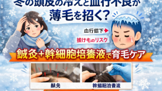 育毛 頭皮の冷えは育毛の大敵|血流と自律神経を整える鍼灸+幹細胞培養液ケア|町田 さがみ鍼灸整骨院 冬になると「頭皮が冷たい」「かゆい・乾燥する」「髪のボリュームが落ちた気がする」などの変化を感じやすくなります。その背景に多いのが、頭皮の冷え → 血行低下 → 栄養・酸素が届きにくい状態です。当院では、冬特有の頭皮トラブルに対して、鍼灸で... 2025.12.17 育毛
