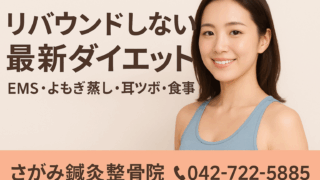 ダイエット 体重より「体質」を変える|EMS・よもぎ蒸し・耳ツボ・食事で最短達成 ダイエットは「体重を落とす」だけでは不十分。大事なのは“リバウンドしにくい体”づくり一時的に体重が落ちても、リバウンドすれば時間・労力・お金のムダ。本記事では、EMS・よもぎ蒸し・耳ツボ・食事の4本柱で、健康的に痩せて維持するための最新ダイ... 2025.10.17 ダイエット